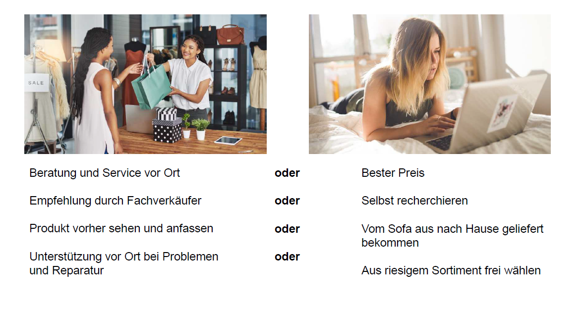 Für mich gibt es nur einen Handel, der all meine Wünsche auf beiden Kanälen gleichzeitig erfüllt. Ich kaufe gerne schnell übers Internet ein; nach wie vor schätze ich aber die schöne und manchmal verführerische Atmosphäre eines gut sortierten Ladens mit freundlichen und kompetenten Mitarbeitern. Gelegentlich ist der Einkaufsbummel, das Flanieren, das Anschauen und Ausprobieren ja sogar selbst das Ziel.